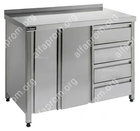 Стол-тумба Кобор СТ/1-120/60 произведена из высококачественной нержавеющей стали, что позволяет использовать предмет в различных цехах. Во избежание прогибов столешница усилена листом ламинированной ДСП толщиной 16 мм. Ножки изделия регулируются по высоте, для исключения проблем с неровным напольным покрытием, предотвращая наклон рабочей поверности.